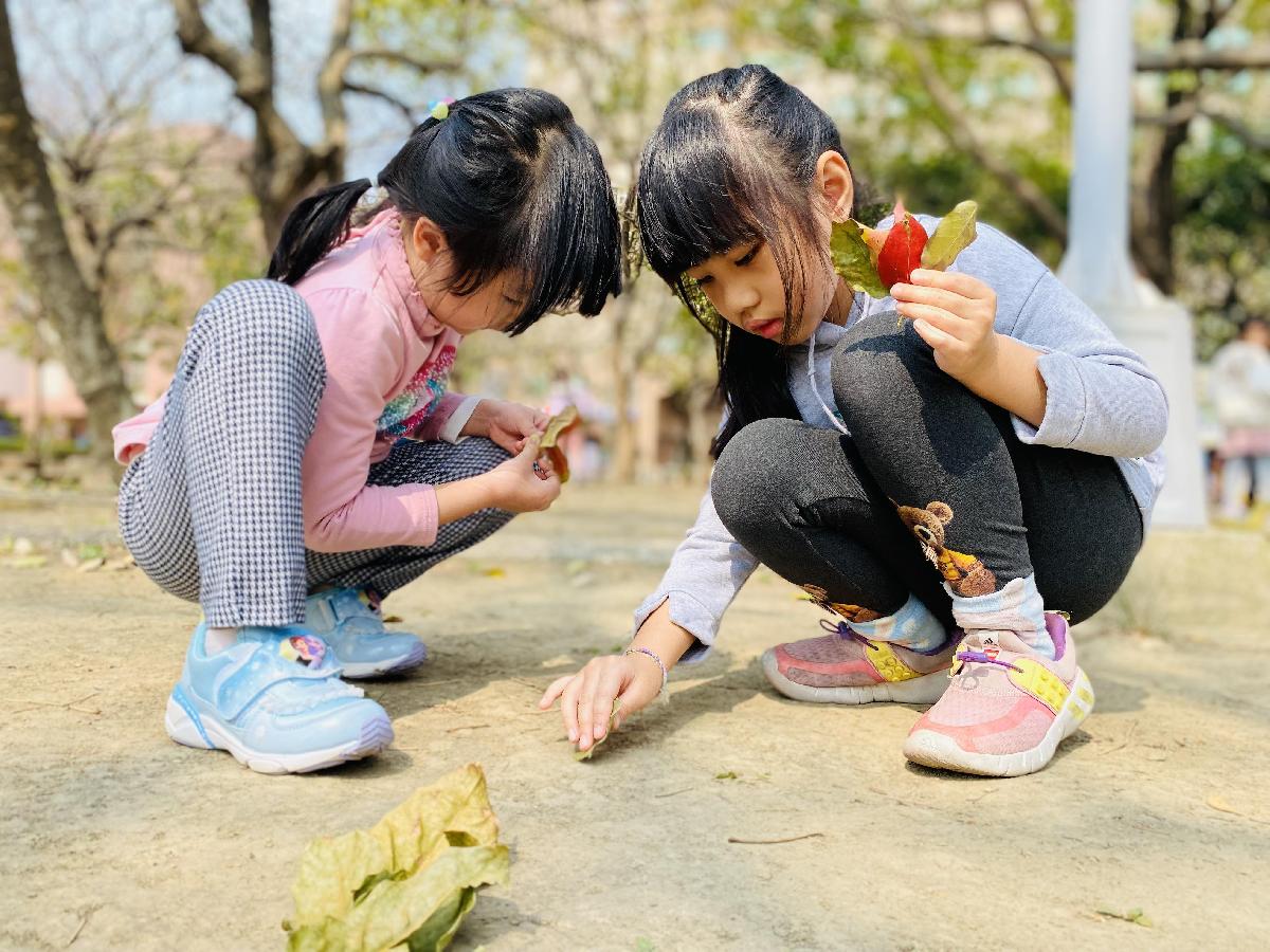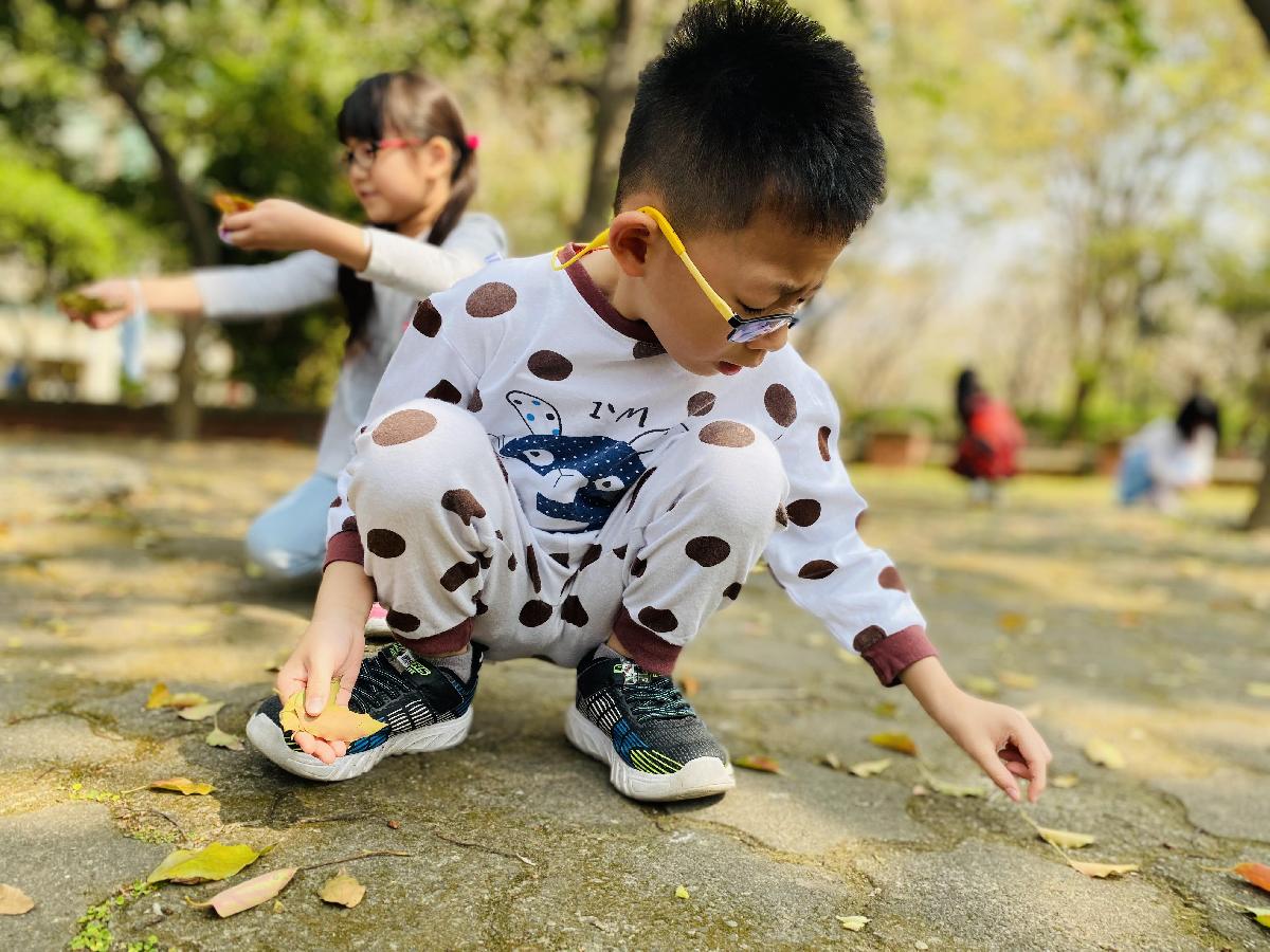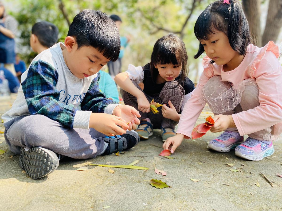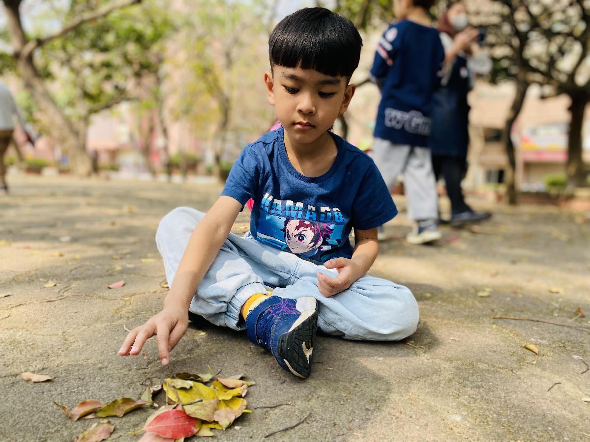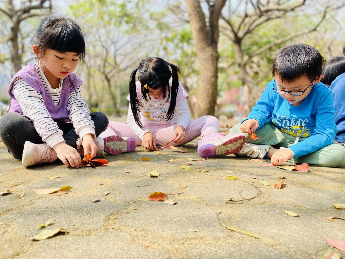 幼兒們利用地上的落葉