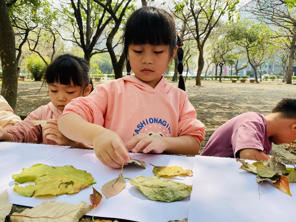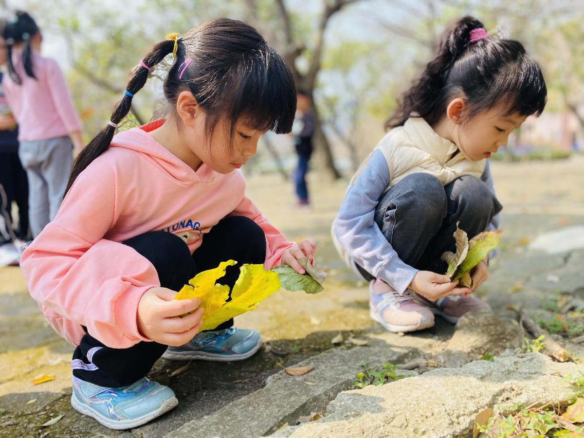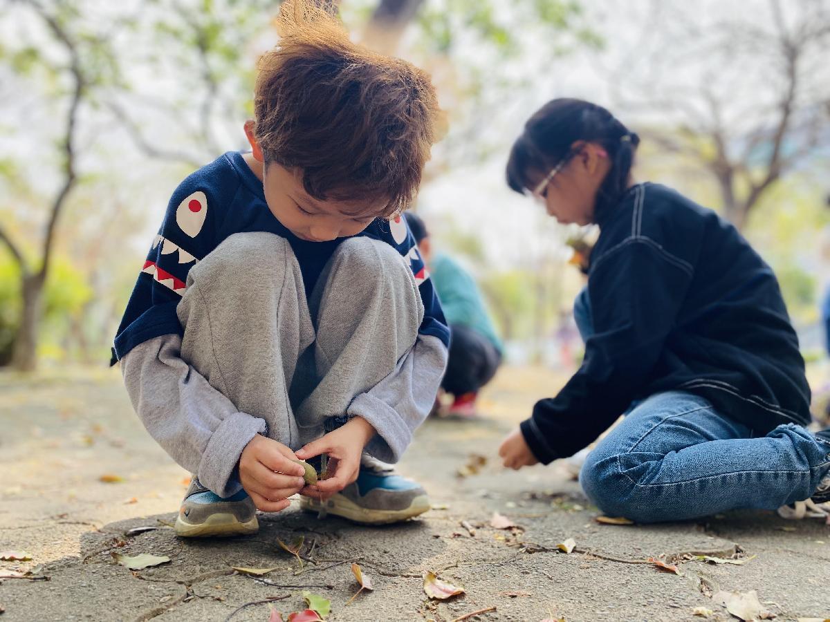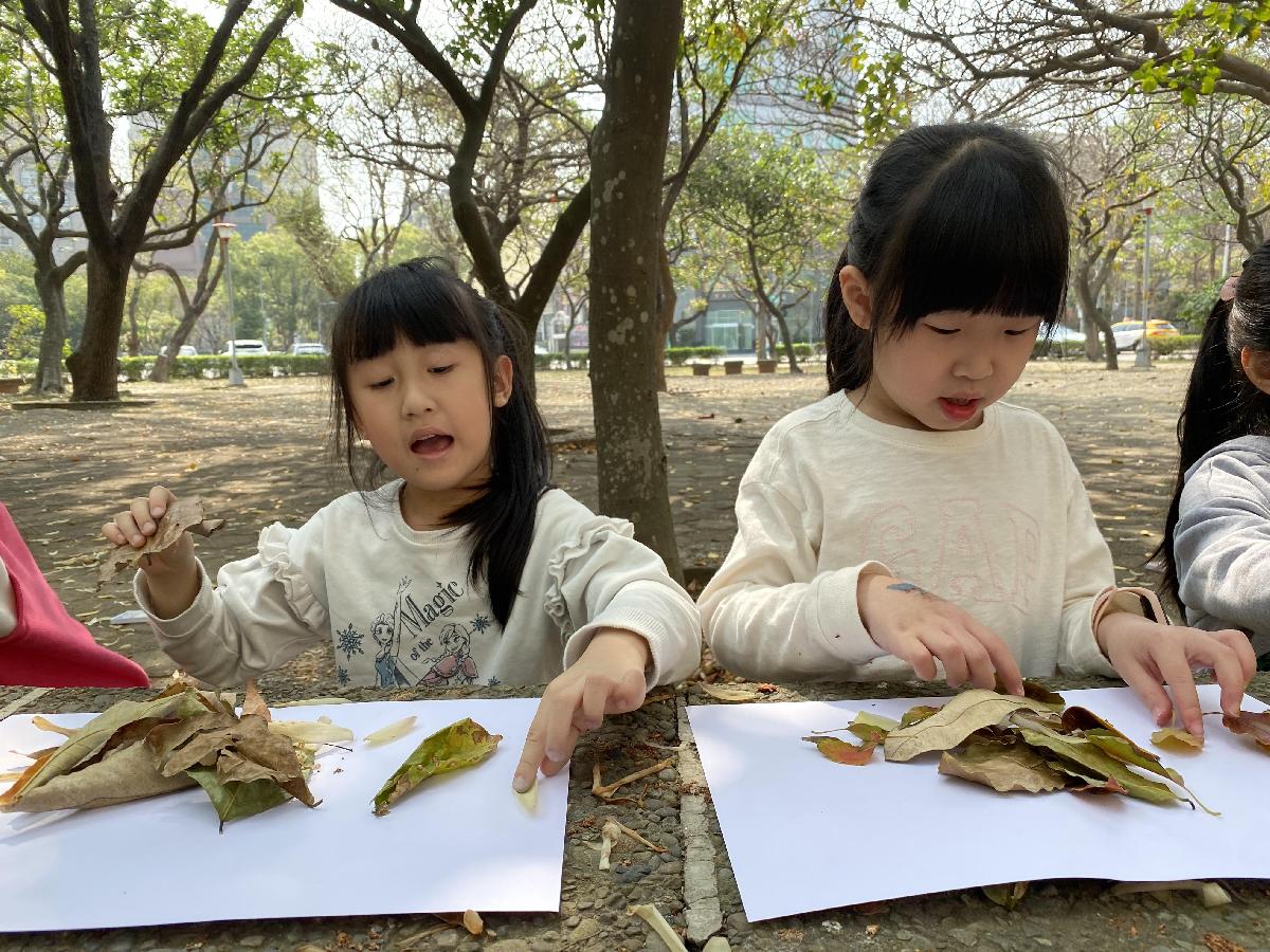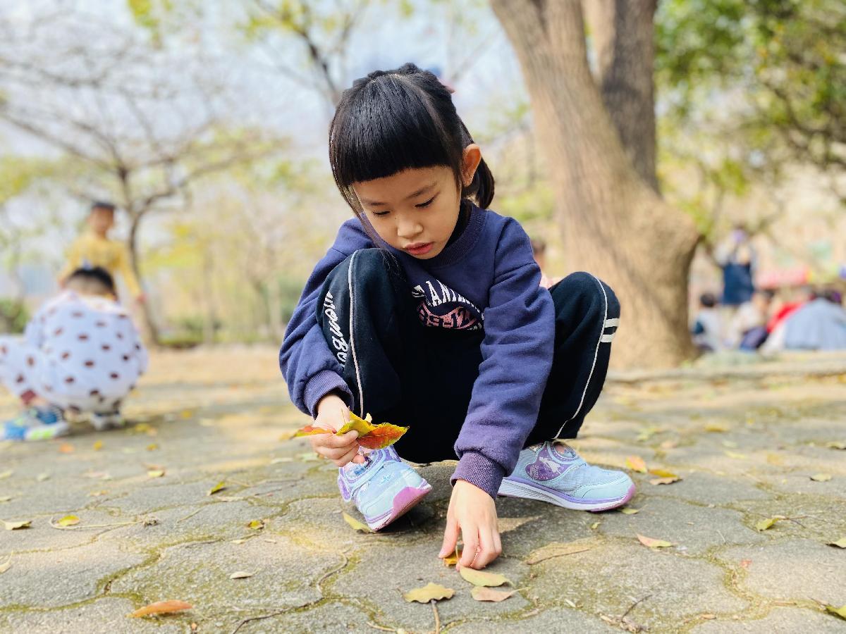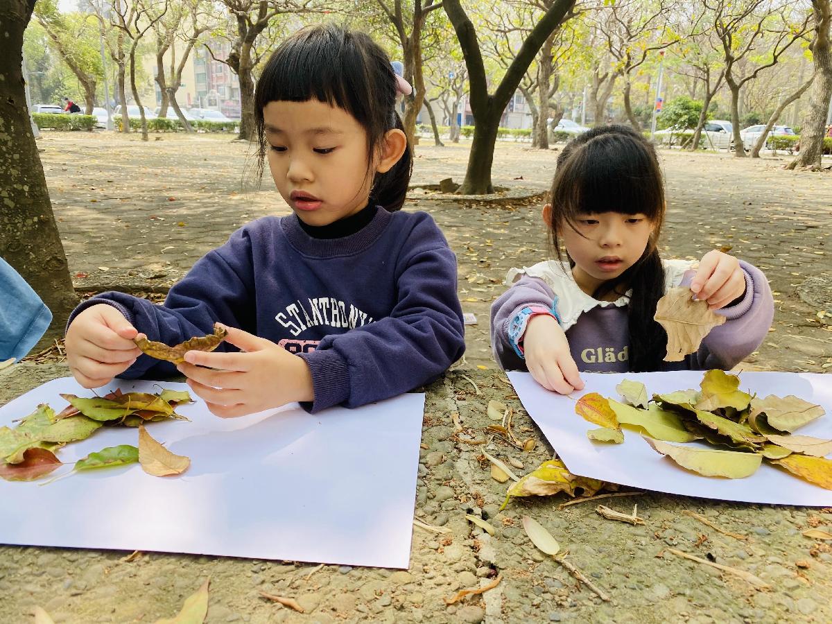 幼兒們利用地上的落葉