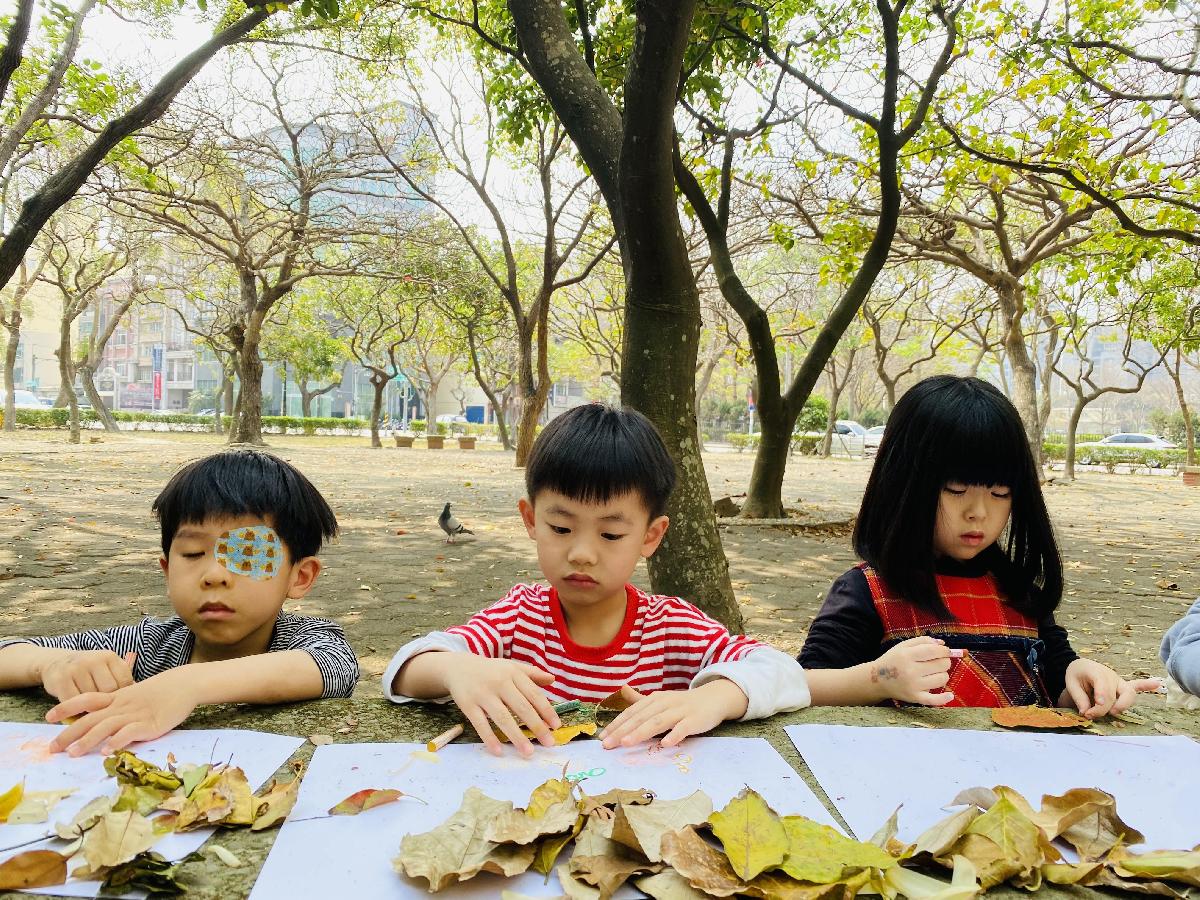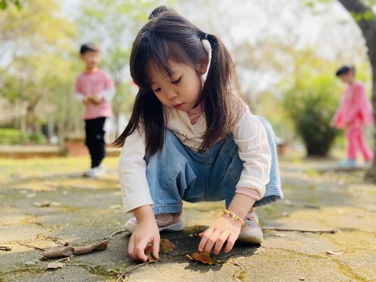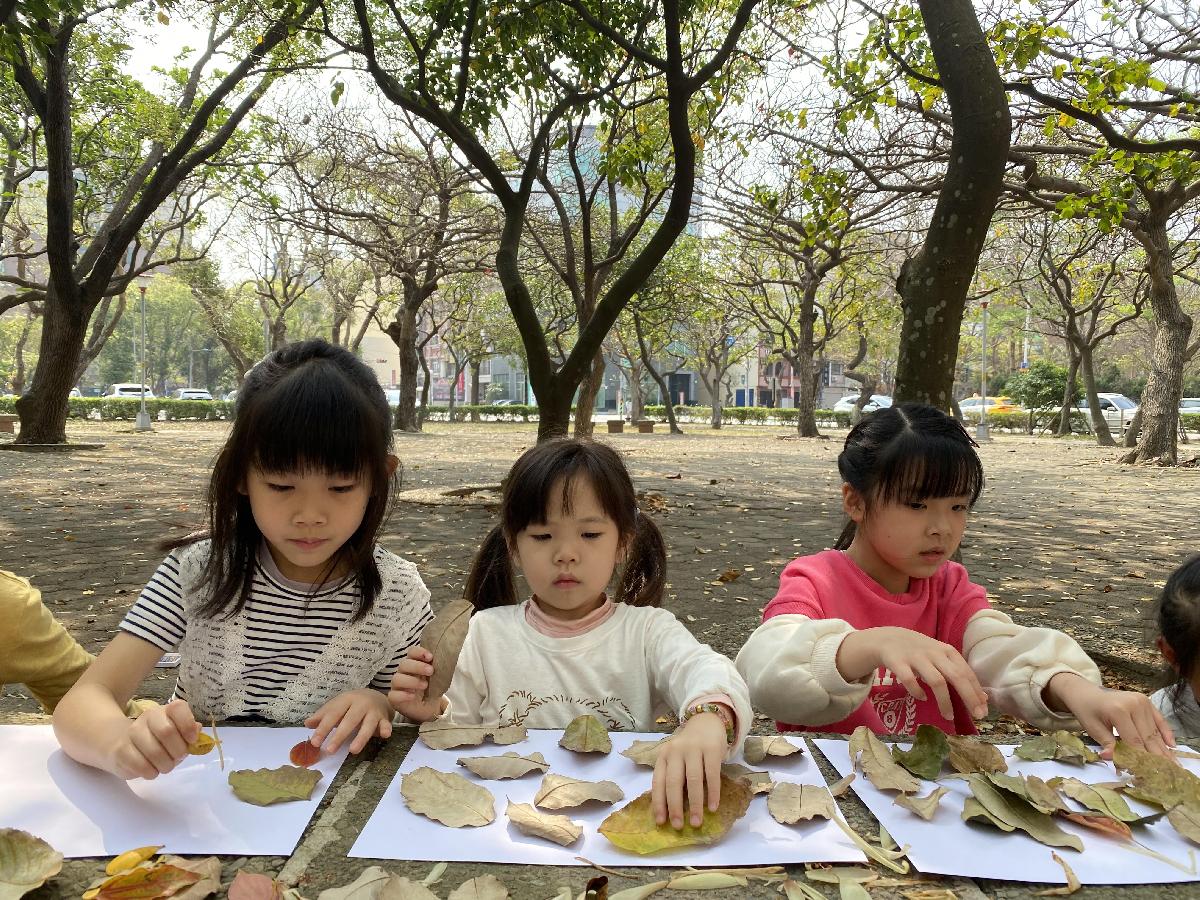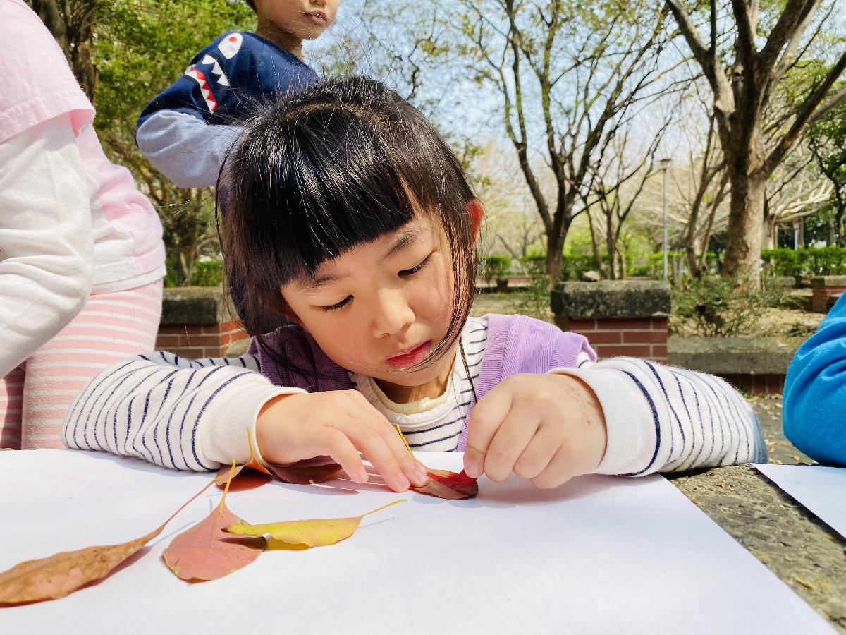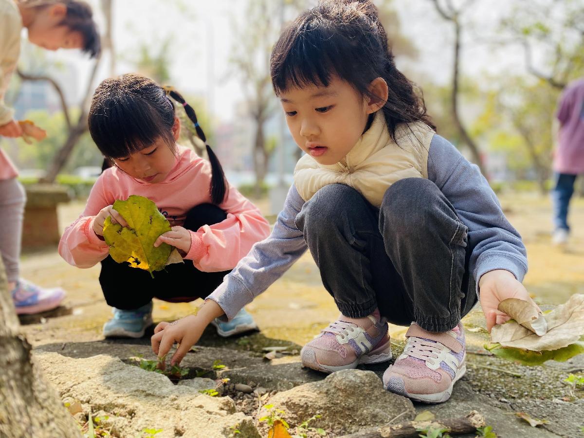 幼兒們利用地上的落葉