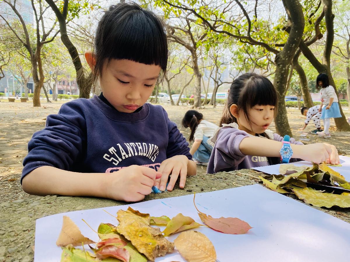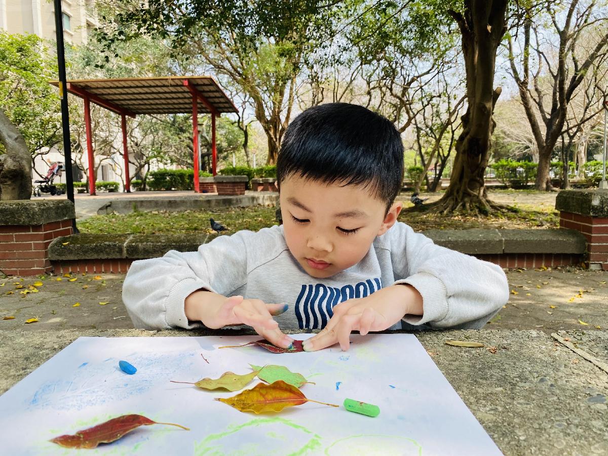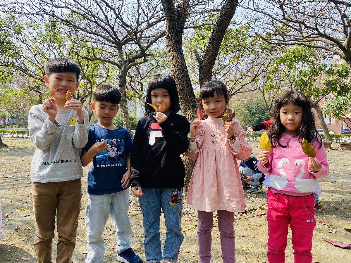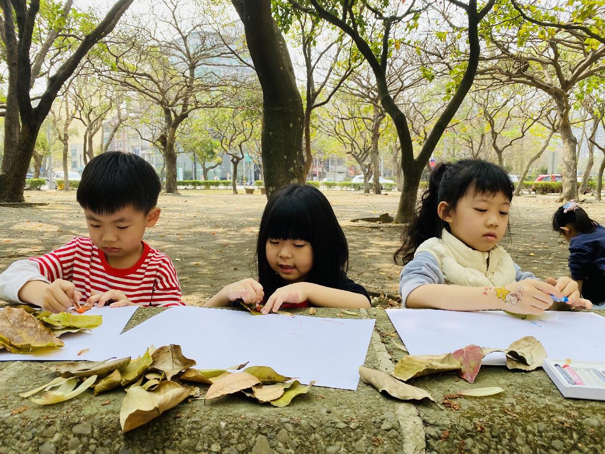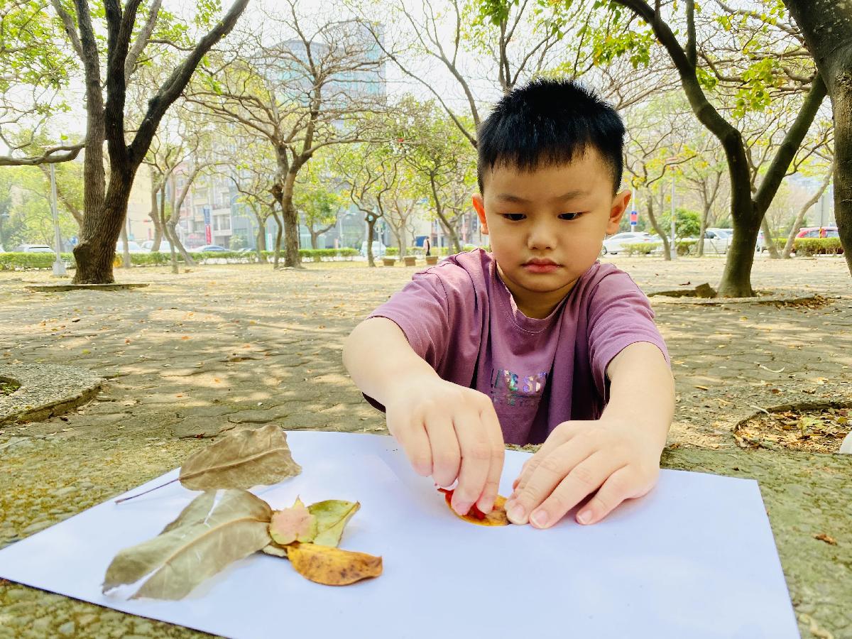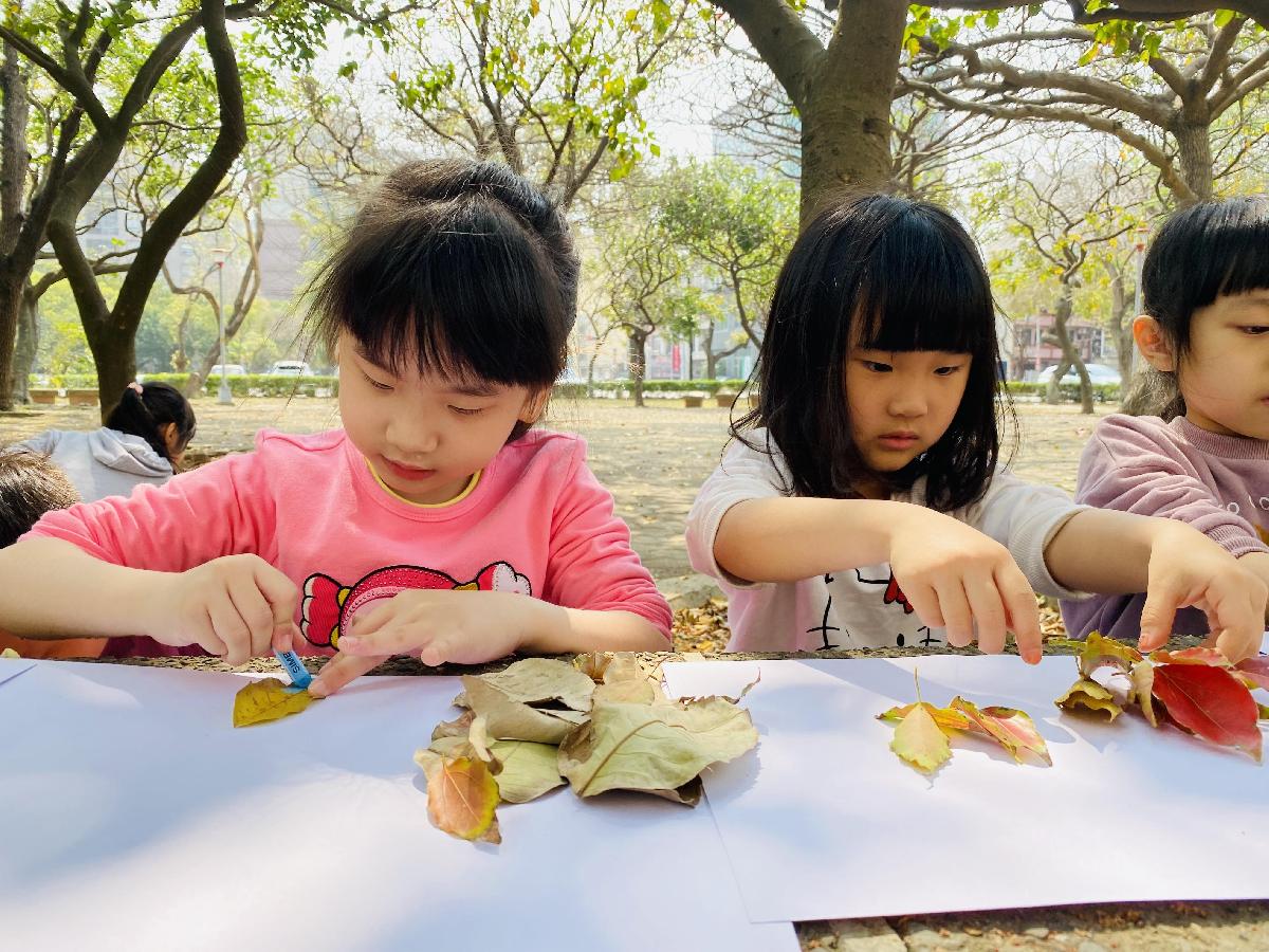 幼兒們利用地上的落葉