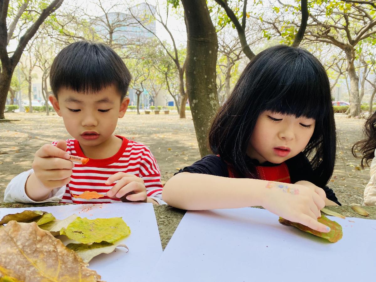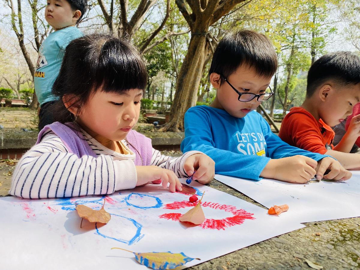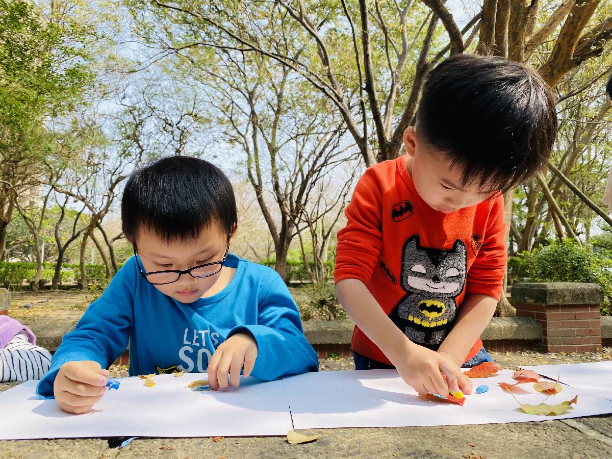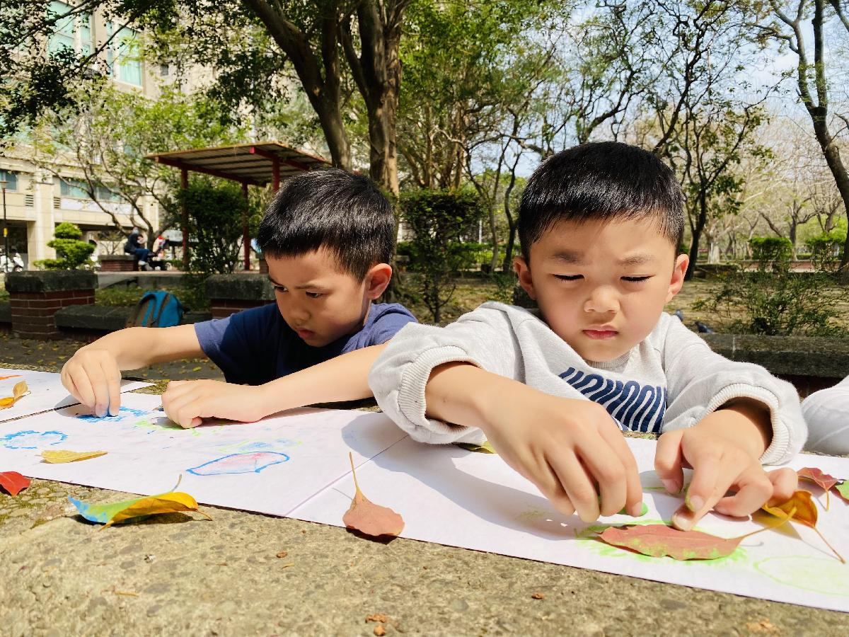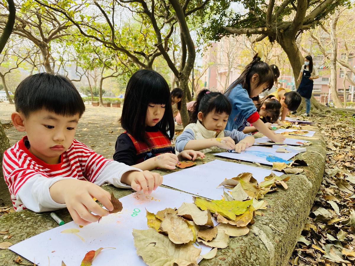 幼兒們利用地上的落葉