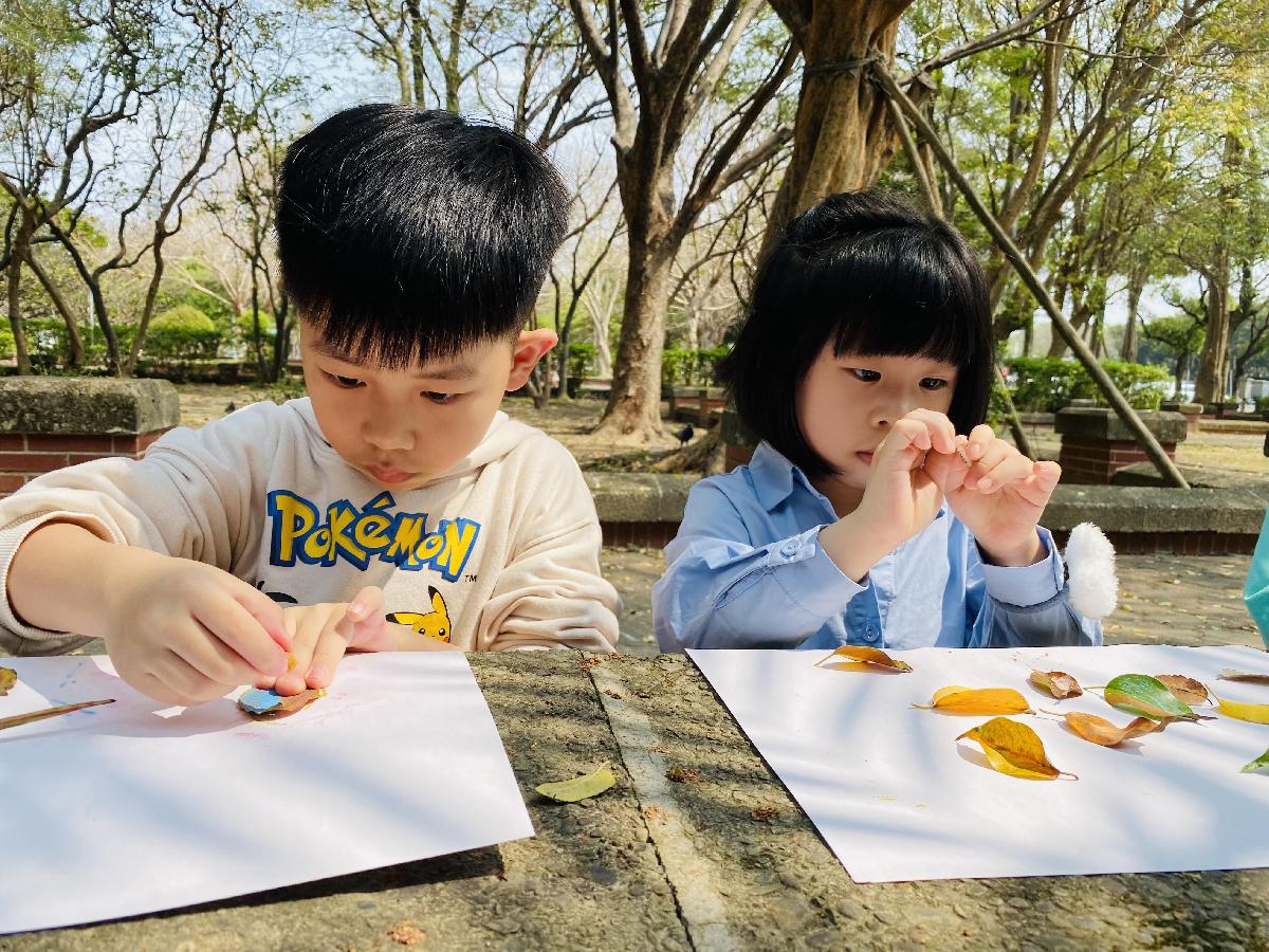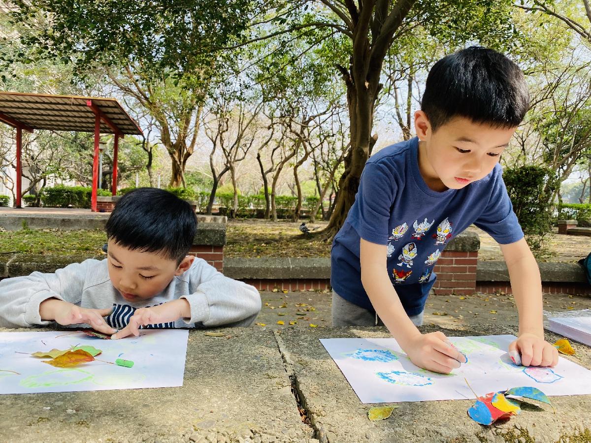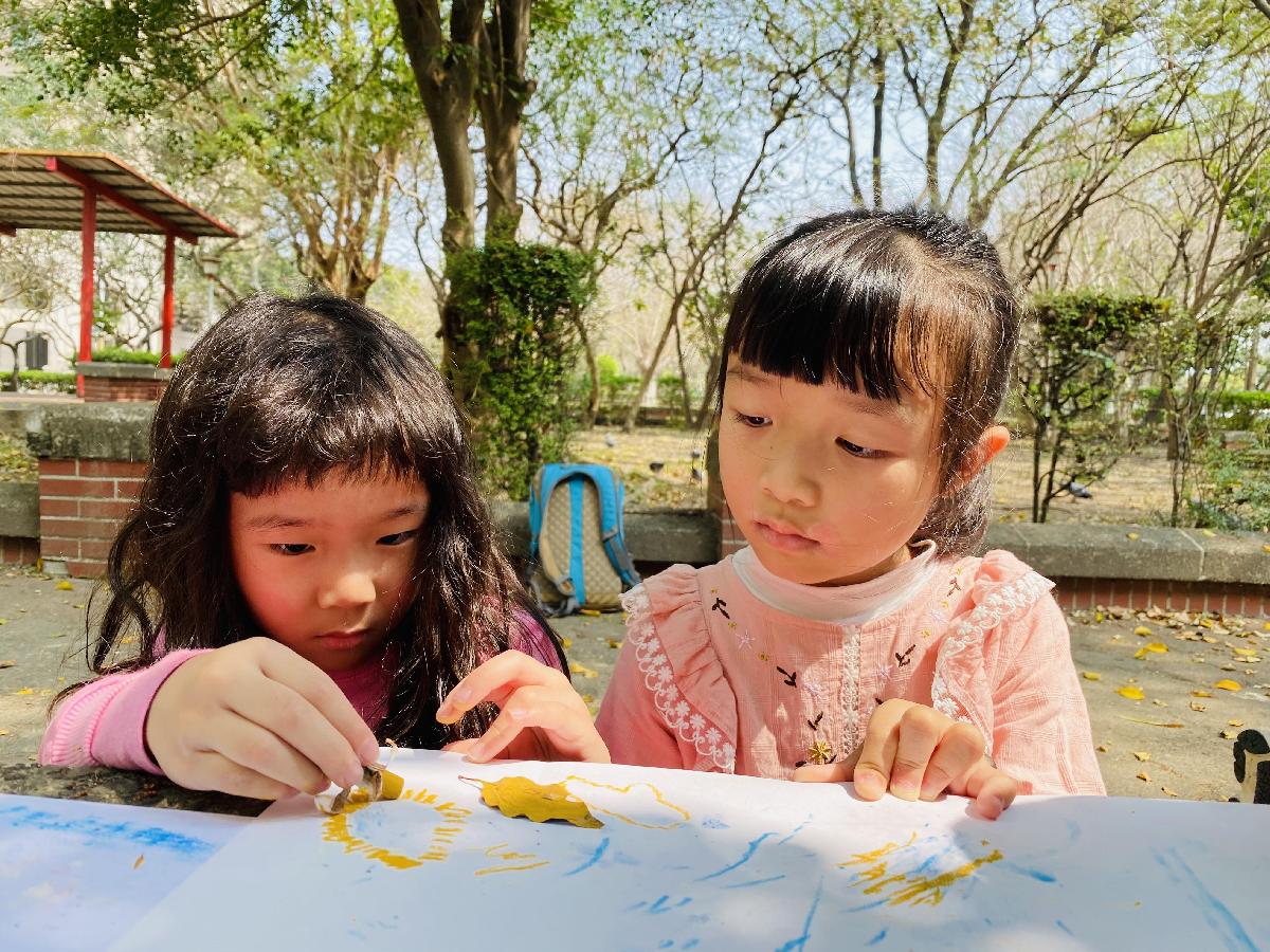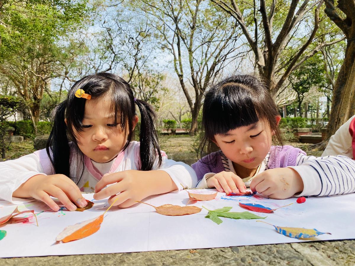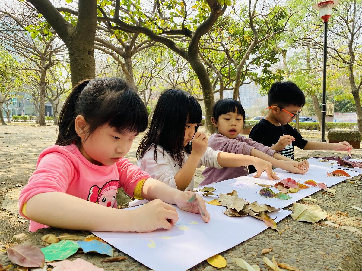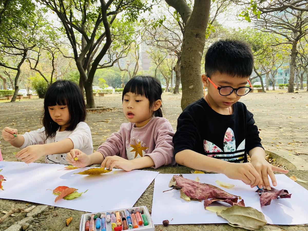 幼兒們利用地上的落葉