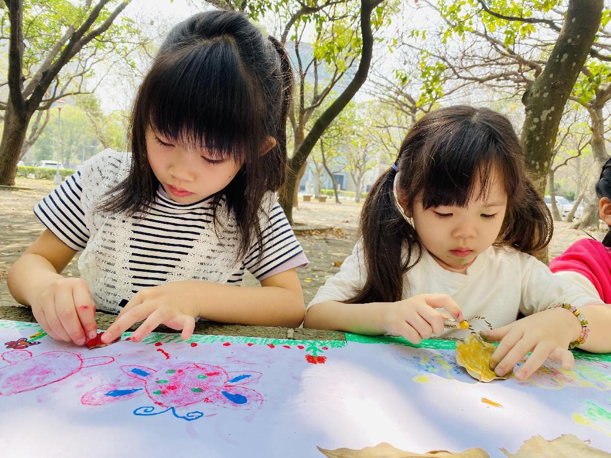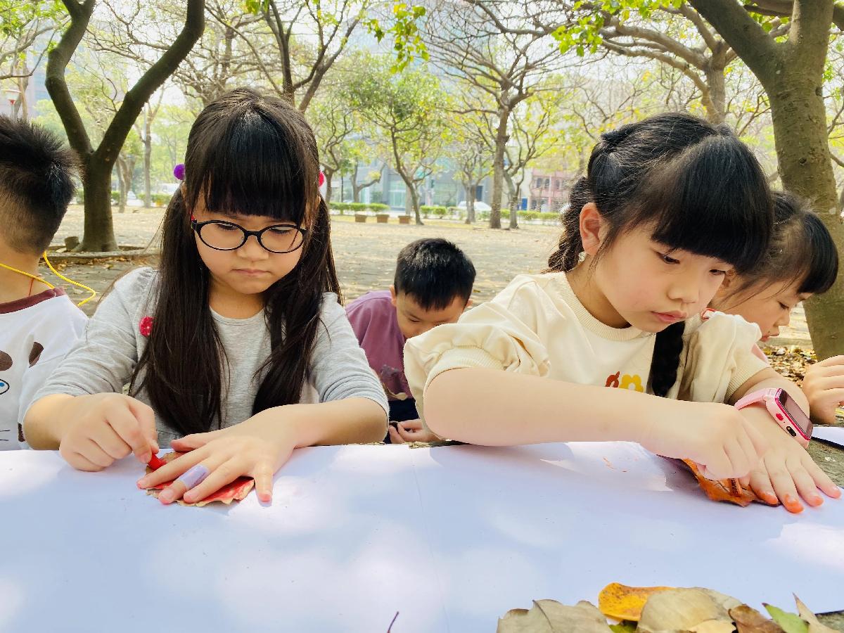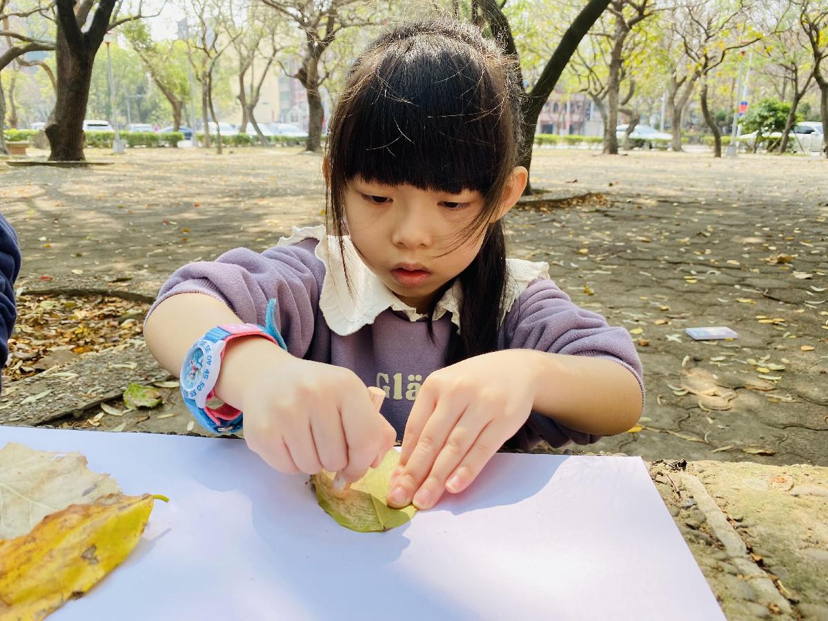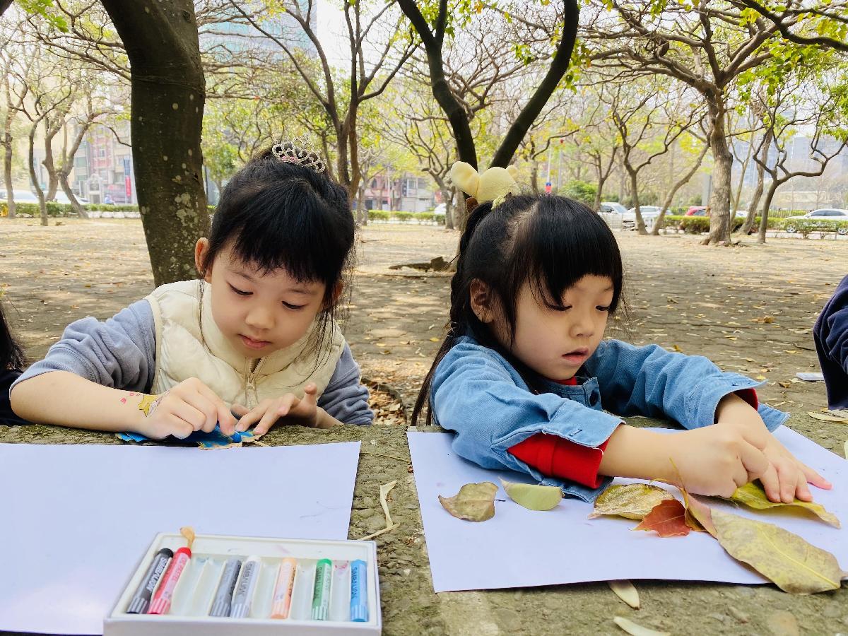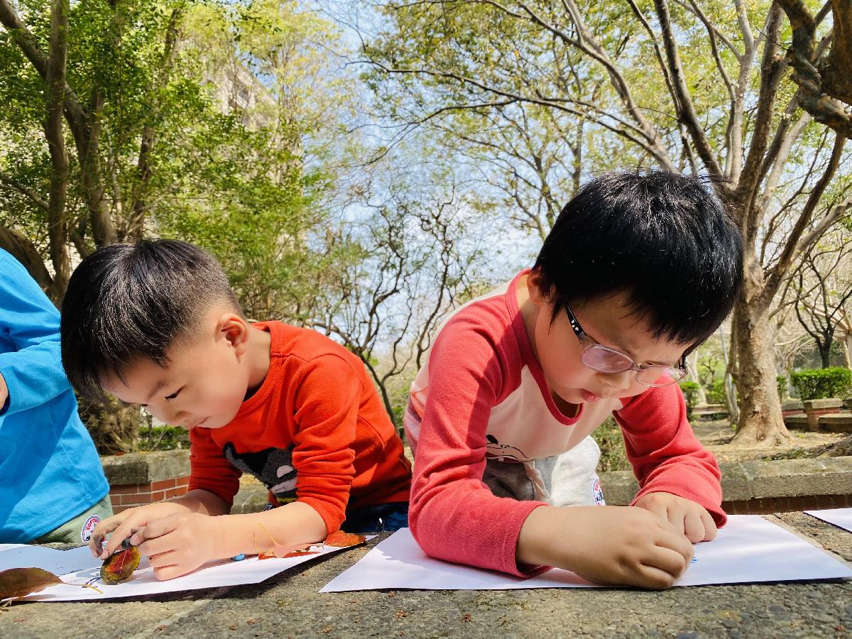 幼兒們利用地上的落葉