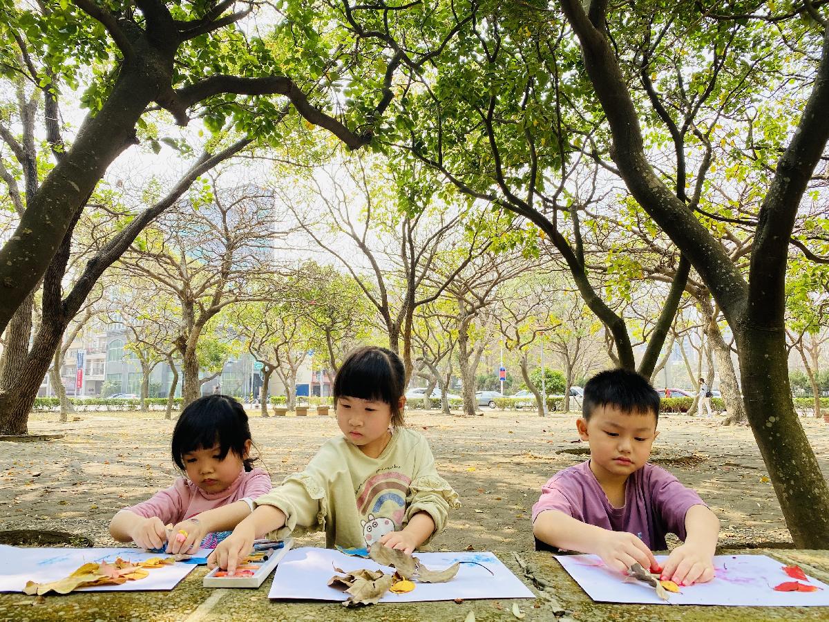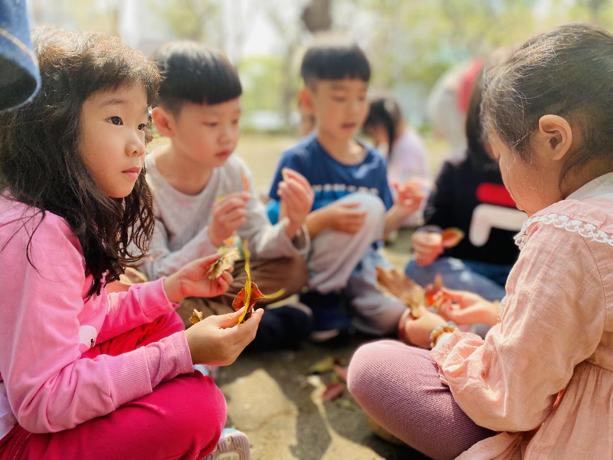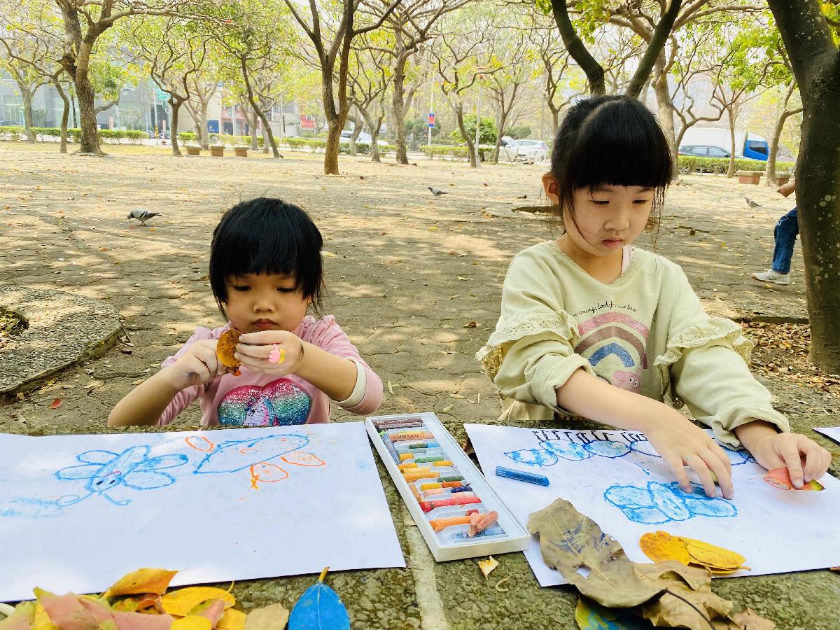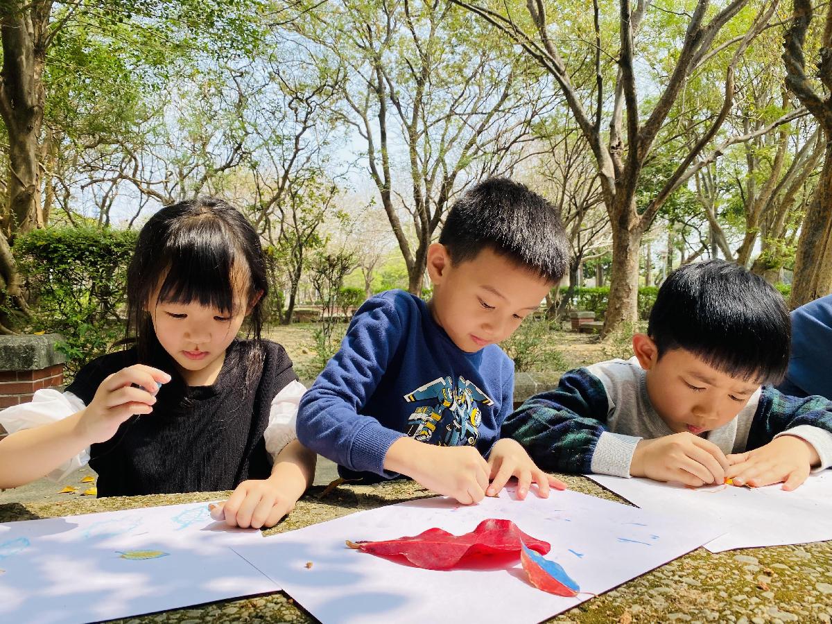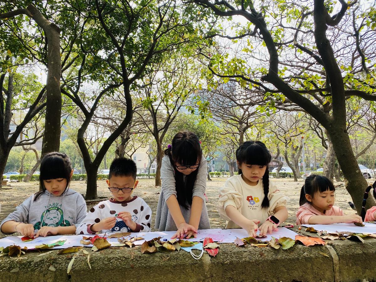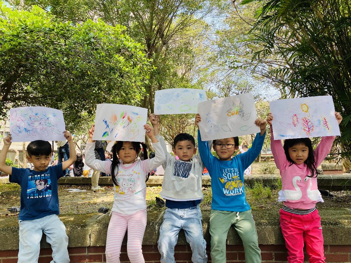 幼兒們利用地上的落葉