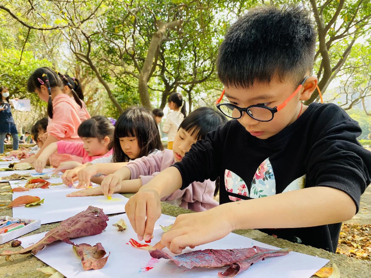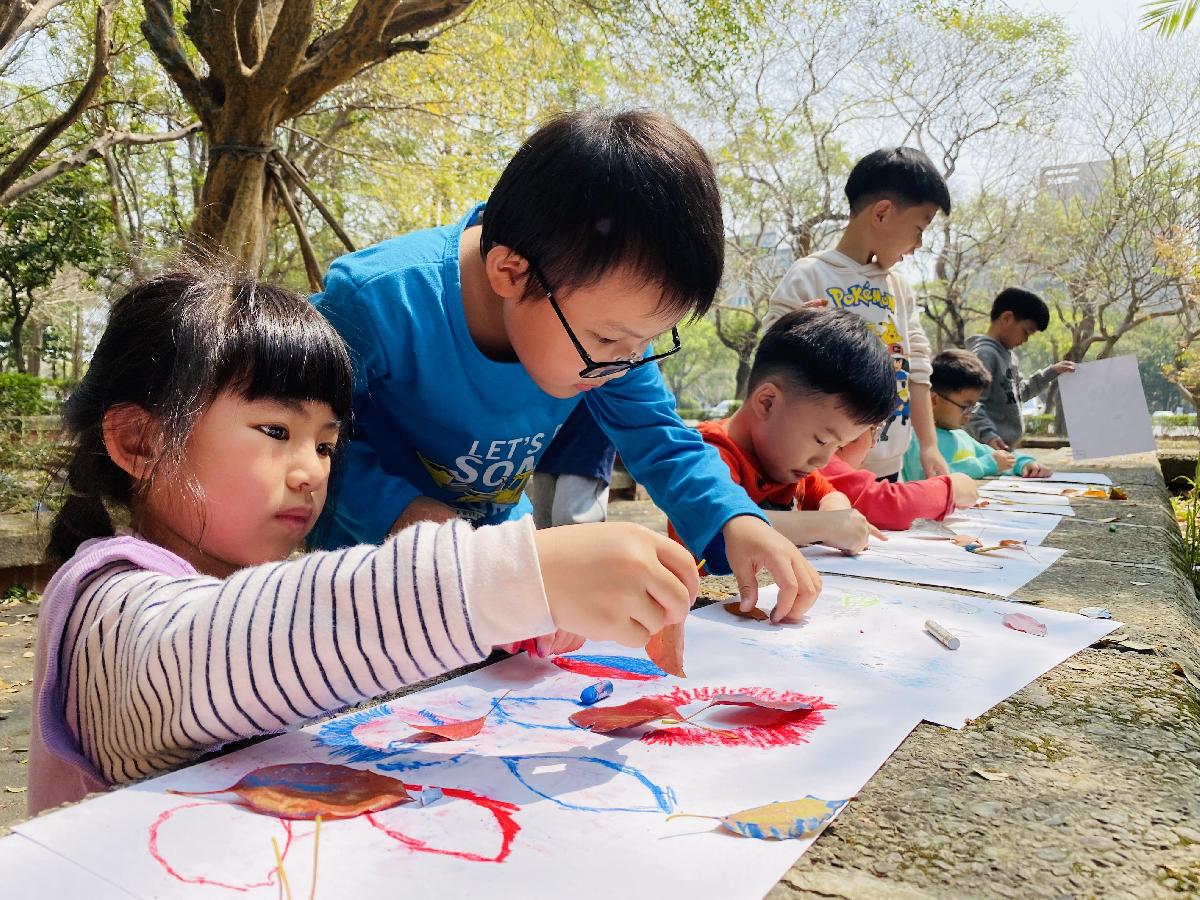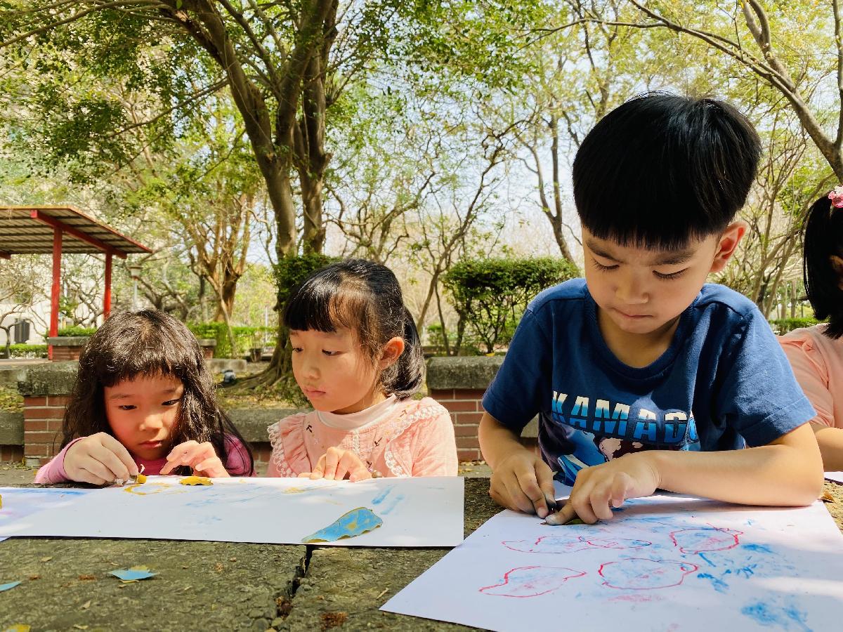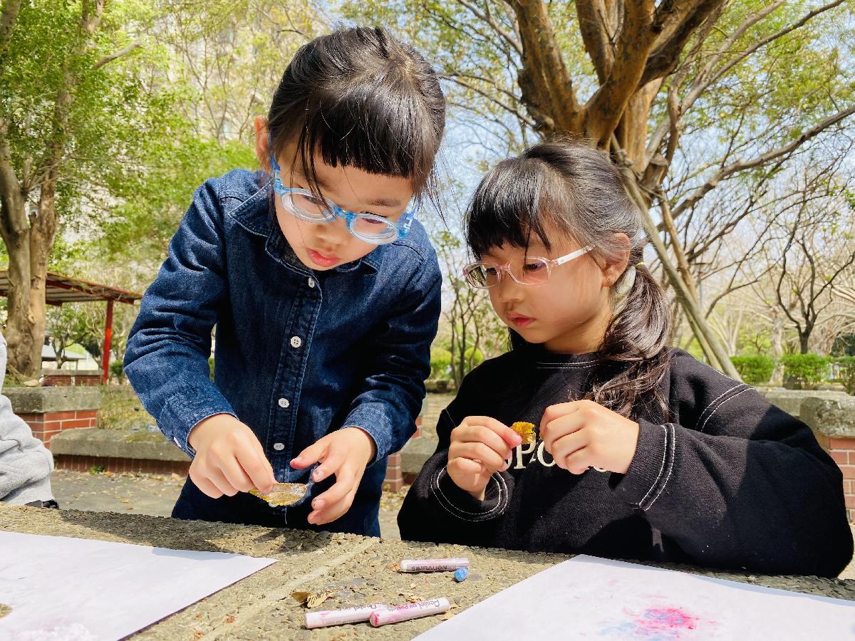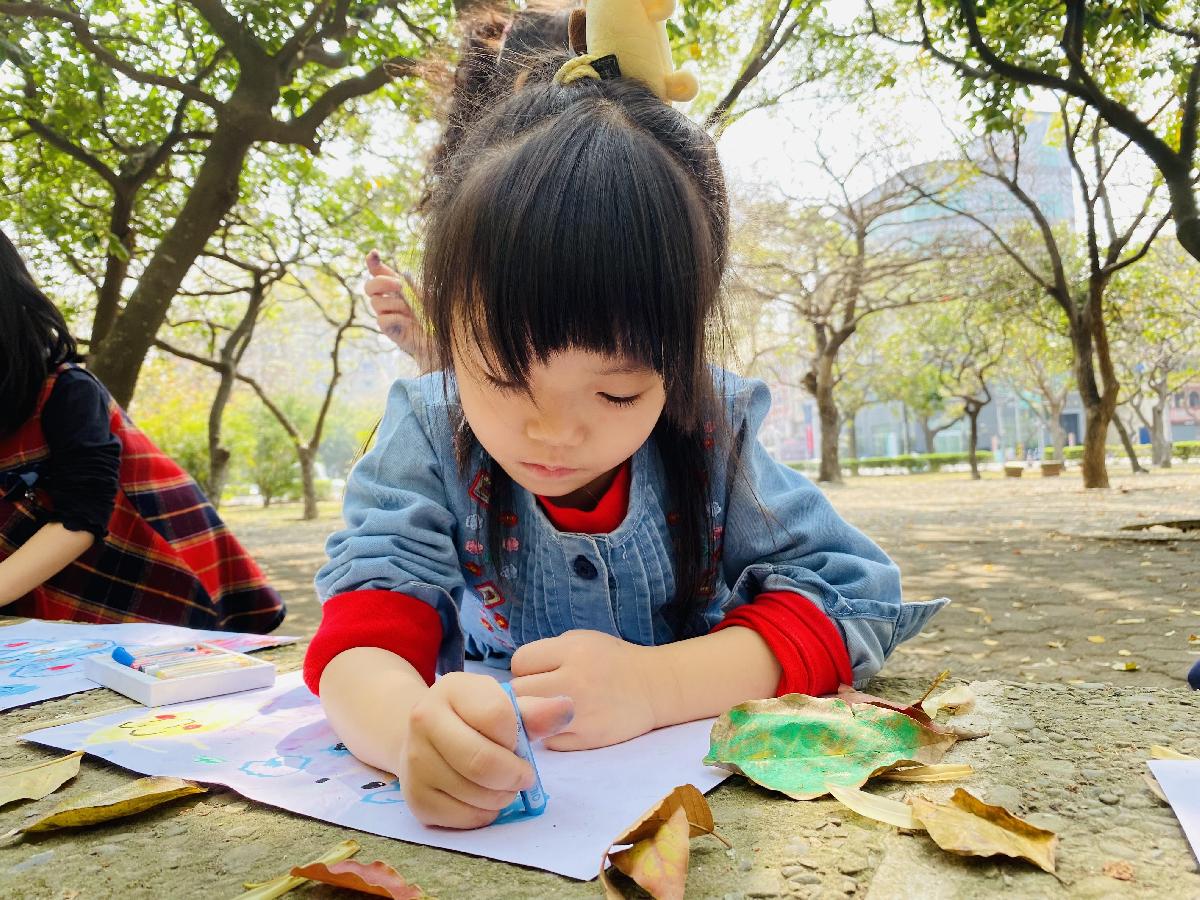 幼兒們利用地上的落葉