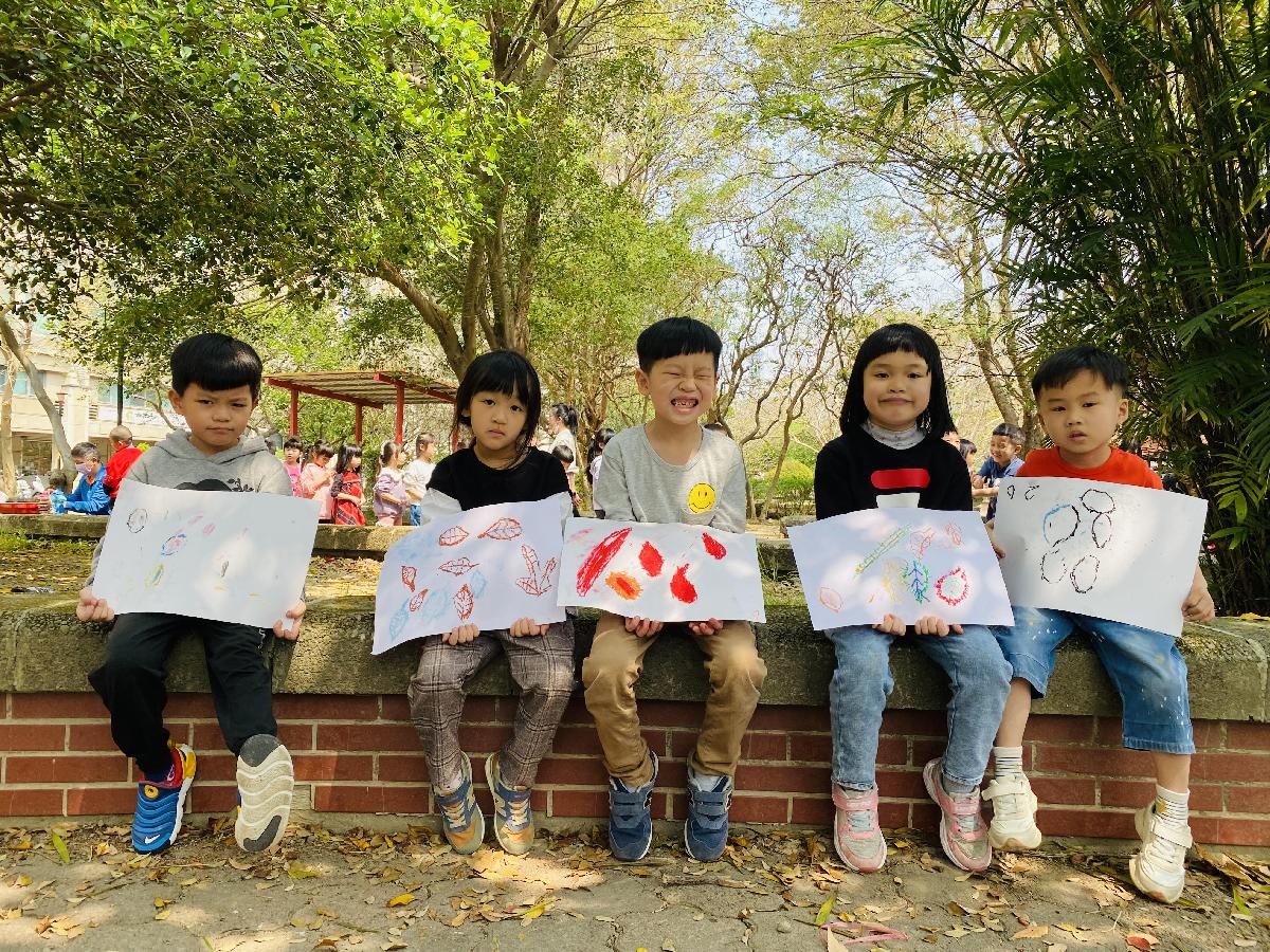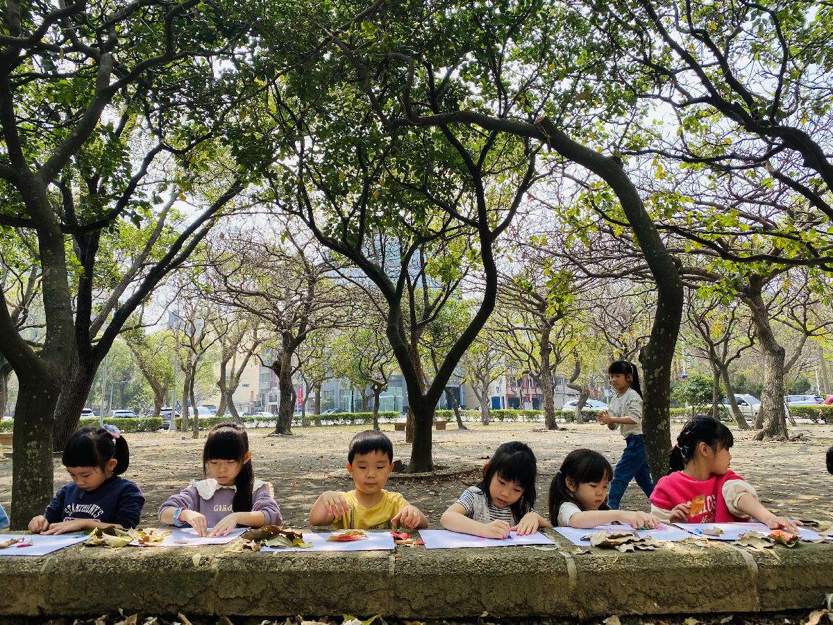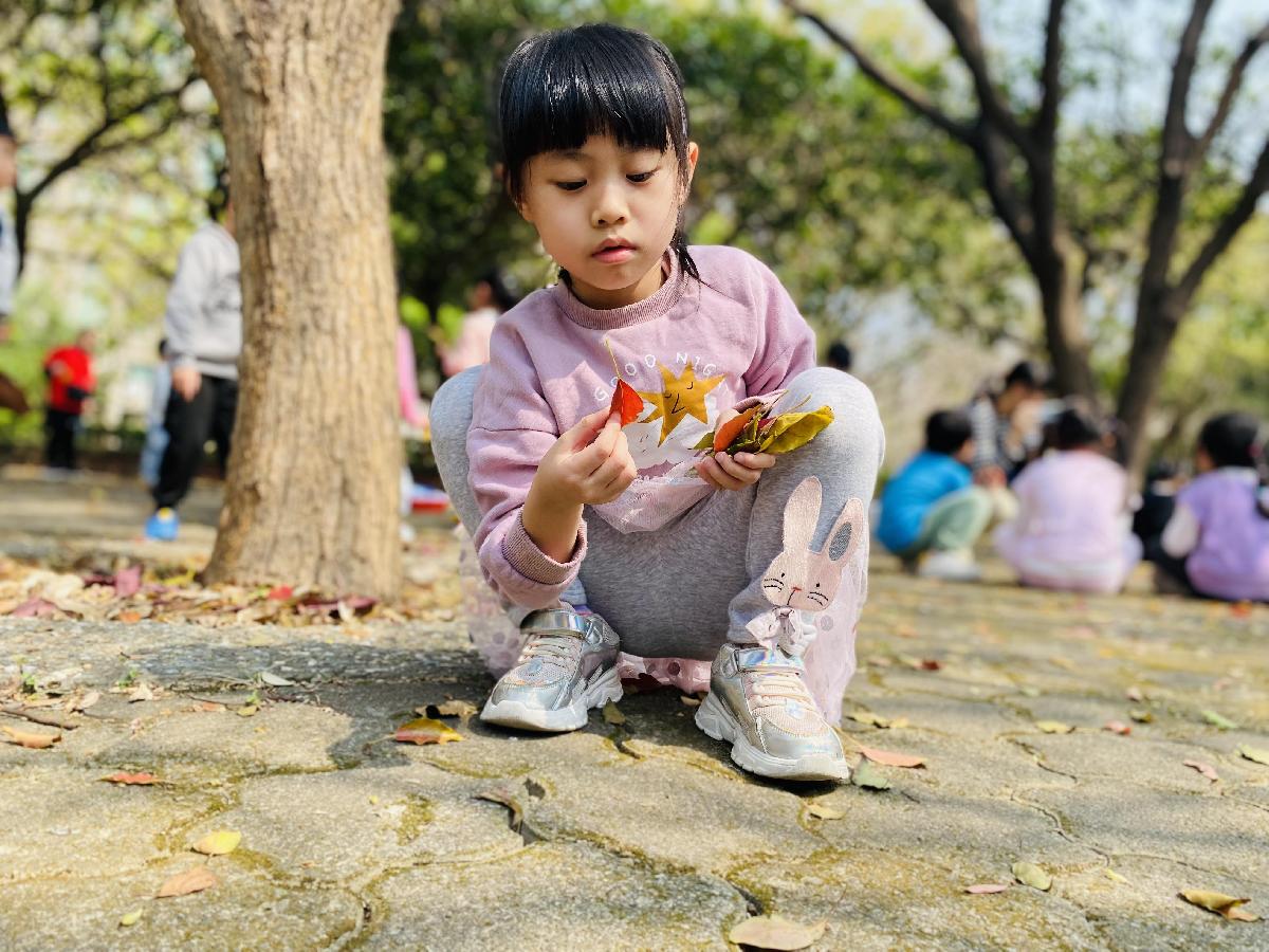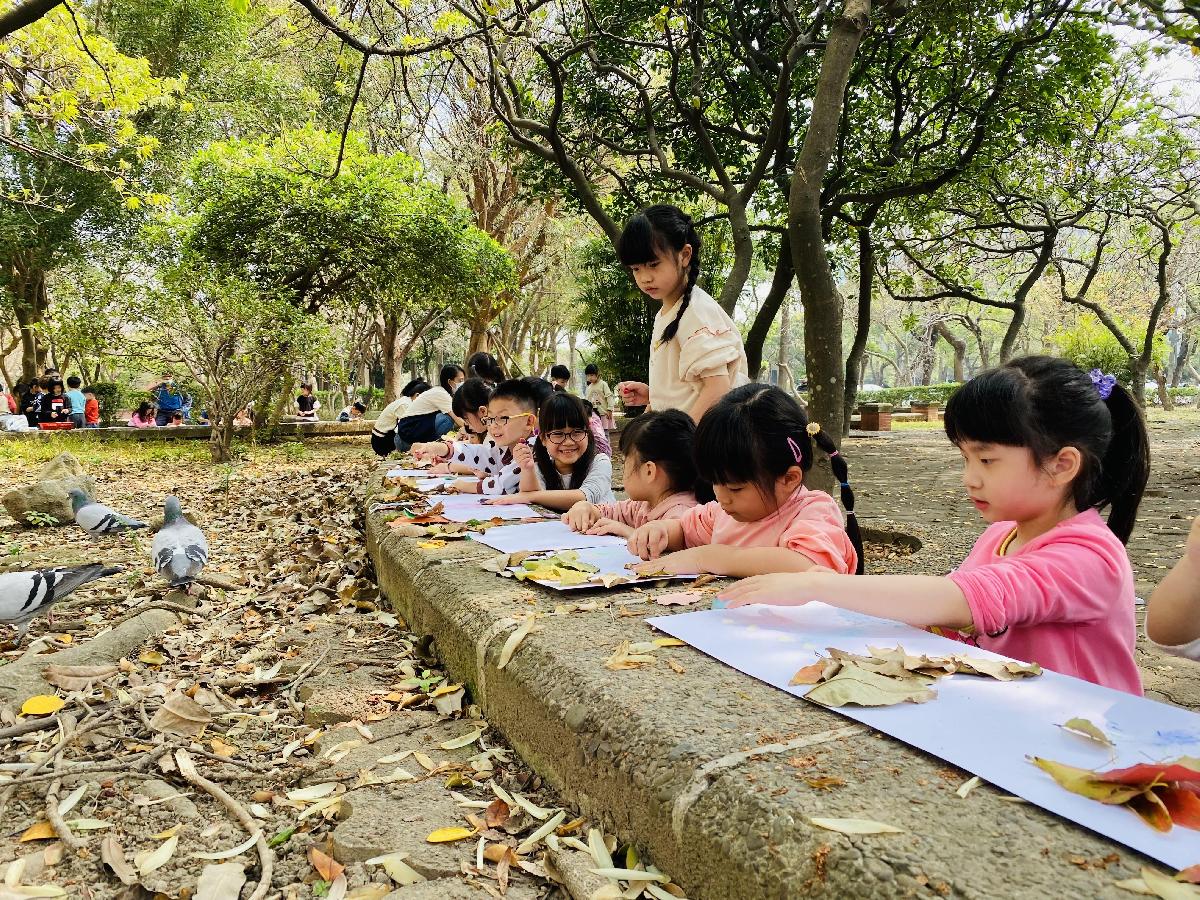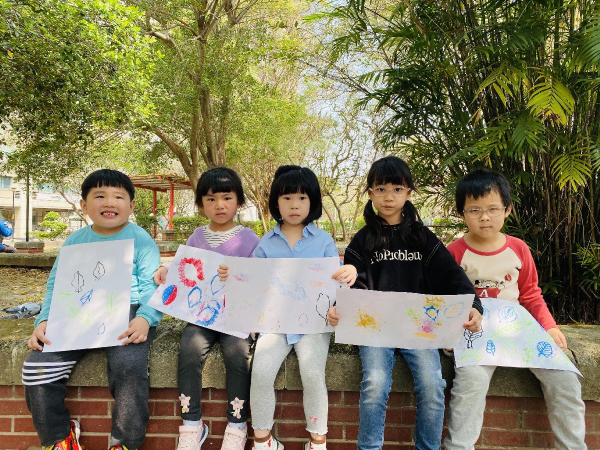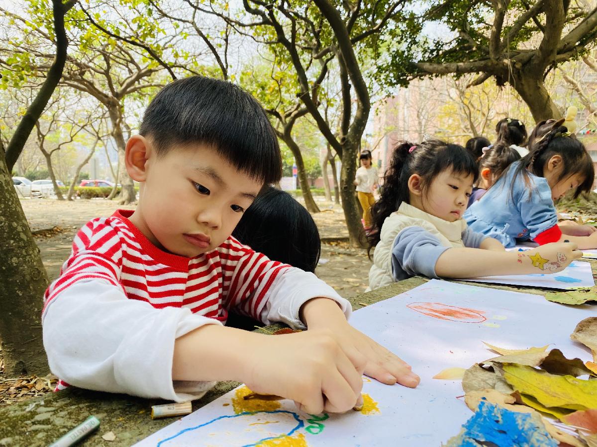 幼兒們利用地上的落葉