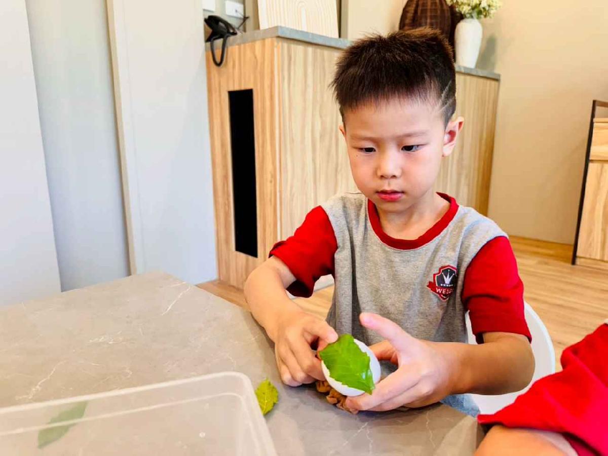 活動中,孩子把葉子貼在蛋上,再替蛋「穿上」絲襪小外套,放進植物染劑裡泡一泡、煮一煮。